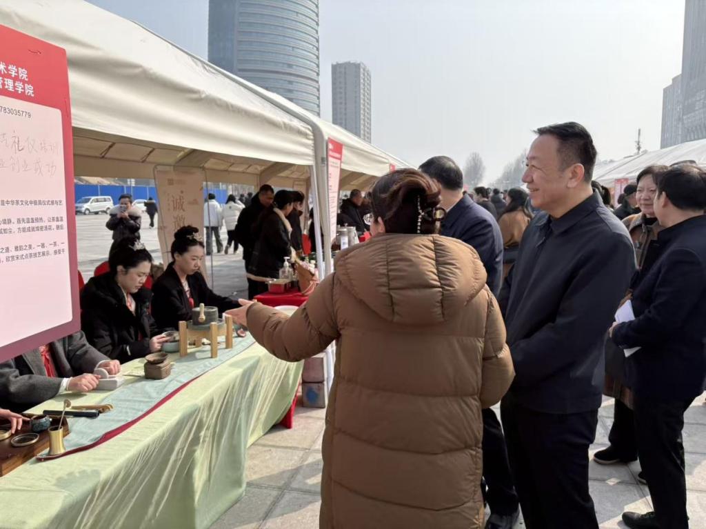 3月10日,河南省总工会2026年“工会送岗乐业河南”就业创业服务活动启动仪式在鹤壁会展中心广场隆重举行。交通服务与管理学院新时代文明实践点茶艺志愿服务队受邀展演,为这场就业创业服务盛会注入浓郁的文化韵味。