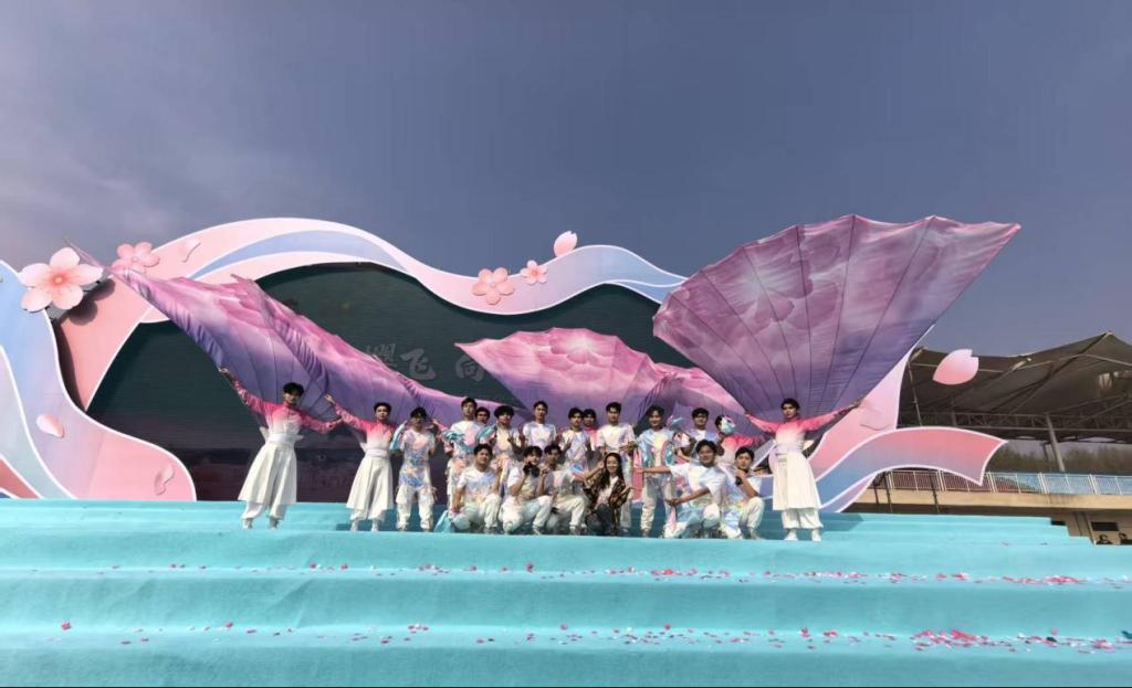 鹤舞樱飞,向新而行。4月2日,2026鹤壁樱花季文旅推介大会在鹤壁市体育公园足球场盛大开幕。交通服务与管理学院新时代文明实践点20名志愿服务队队员,经过一周的高强度排练,以昂扬之态、翩跹舞姿亮相开幕式。