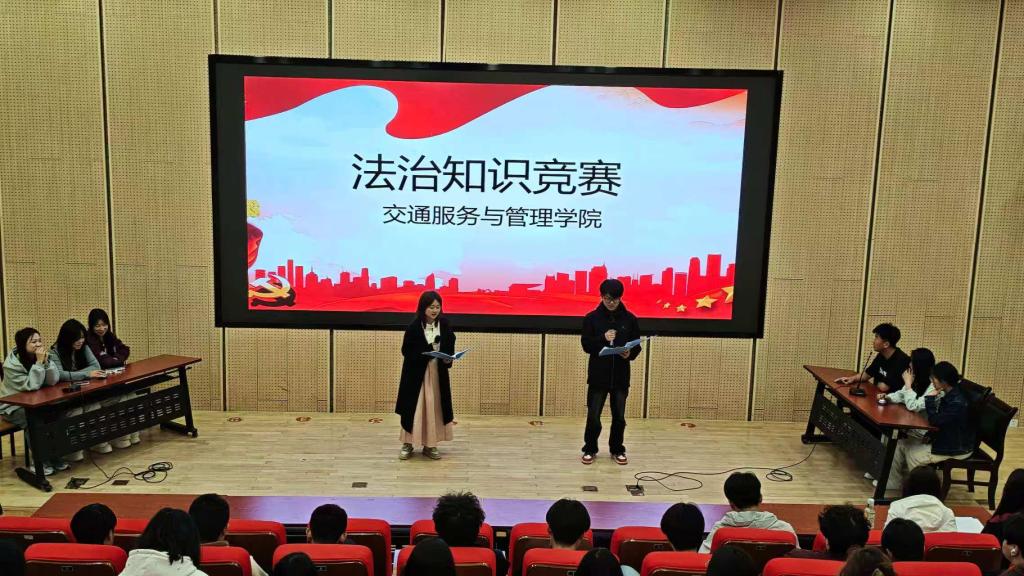为深入学习贯彻习近平法治思想,进一步提升同学们的法治素养和法治意识,营造尊法学法守法用法的良好校园氛围,4月1日,交通服务与管理学院在一号报告厅举办“学法懂法守底线,普法用法促成长”主题竞赛活动。