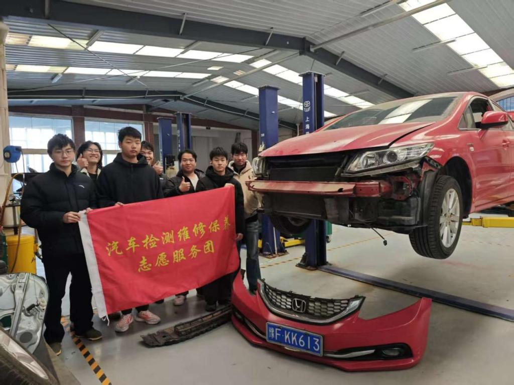 活动现场,服务队队员分工协作,充分发挥专业所学,在指导老师带领下,有序完成车辆检测、零件拆卸、打磨、焊接、安装、测试等工序,高质量完成了学校教职工车辆保险杠修复、雾灯更换、电瓶养护等项目,受到车主的好评和感谢。